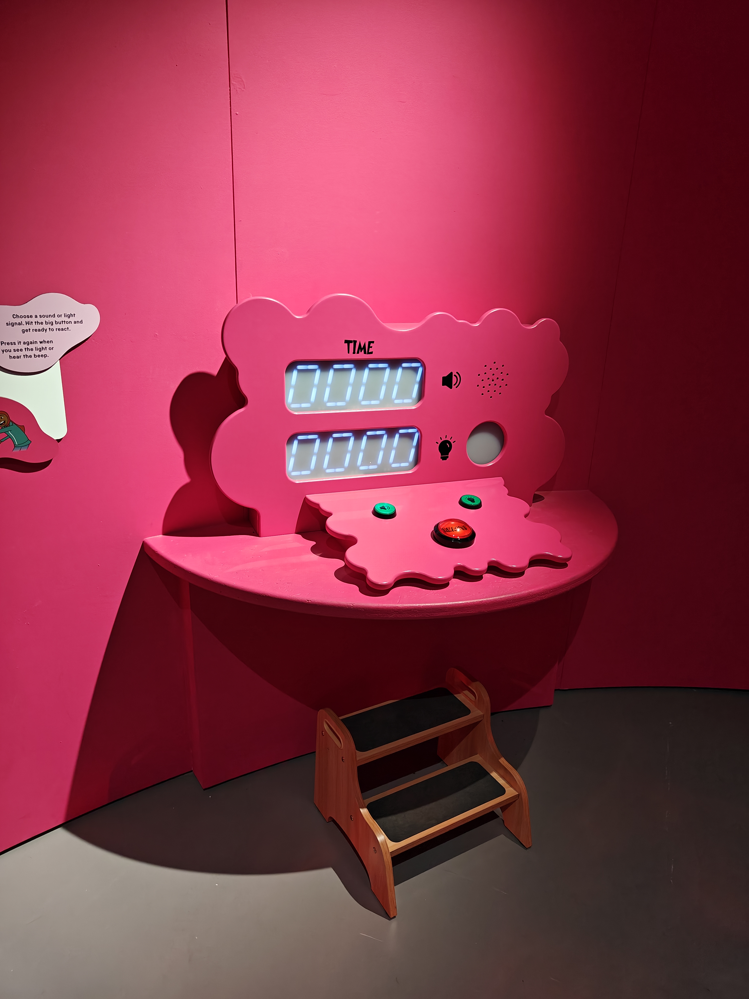 This fun interactive was to demonstrate the reaction times between light and sound. Upon button press, the light or sound will trigger randomly within 5 seconds requiring the user to react.